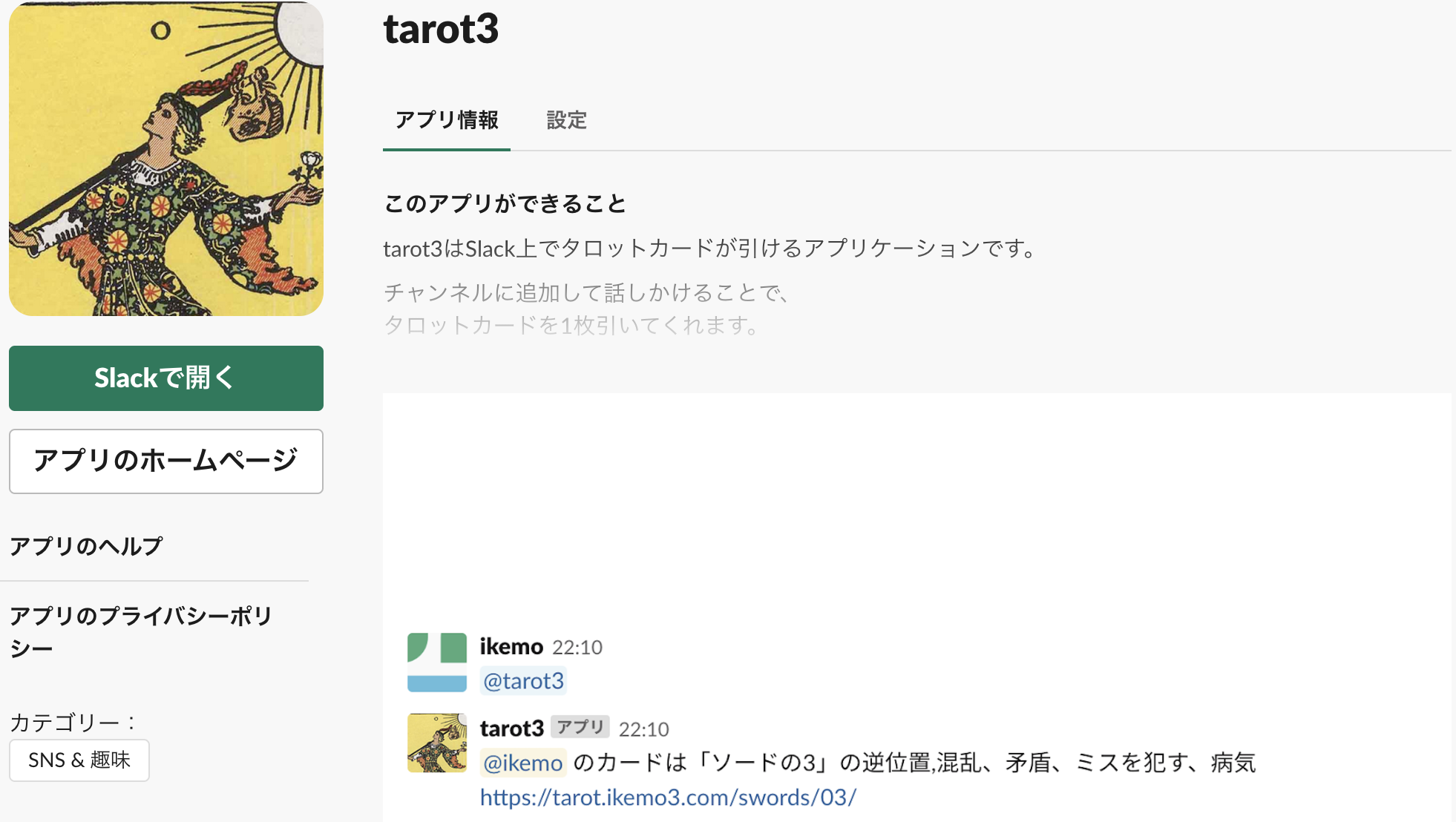 昔 Twitter で動かしていたタロットカードを引く Bot @tarot3 を Slack Bot として復活させたものです。 サーバレスの技術を使って動かしています。